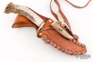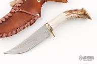 This fighter by Ken Richardson features an upswept 1085 blade with jeweled flats and satin grinds, .096" blade stock and 1.426" blade depth, hidden tang construction. The handle has a brass guard and crown stag grip, red/white/black spacers. Has scrimshaw on the butt. Comes with a brown leather sheath and Maker's knife care information. Has some light scratches, otherwise great condition.