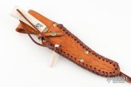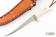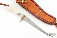 This fillet knife by Ken Richardson features an upswept 1095 blade with jeweled flats and satin grinds, .062" blade stock and .945" blade depth, hidden tang construction. The handle has a brass guard and faux stag grip, red/white/black spacers. Has scrimshaw on the handle. Comes with a brown leather sheath and Maker's knife care information. Has some light scratches, otherwise great condition.