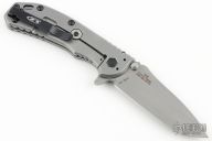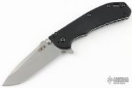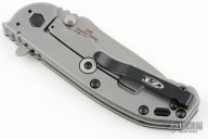 This 0566 Hinder Design Flipper by Zero Tolerance features a tumble finished drop point blade with swedge, dual thumb studs, notched thumb rest and flipper. The handle is comprised of a black G10 scale over a titanium liner and a tumbled titanium lockside over black barrel spacers. The black coated steel tip up clip is reversible for right or left hand carry. Lanyard hole in pommel. Comes with original box and papers. Excellent condition. S/N 19410