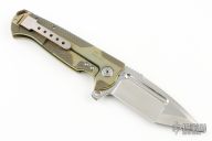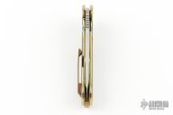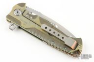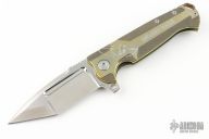 This ADV Ronin framelock flipper has a satin finished spear point tanto blade with notched flipper and thumbrest. Handle has a two-tone finished titanium frame, anodized titanium hardware and titanium backspacer, tip up anodized titanium clip. Has stainless steel lockbar insert and lockbar stabilizer. Nice smooth action, detent, lockup and blade seating. Comes with a nylon zippered case. Excellent condition.