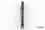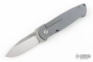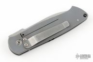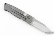 This Tab-Stop folder by Dozier Knives got the 1999 Knifemakers Guild Show A.G. Russell award for the most innovative new folder of the show. It features a satin finished sheepsfoot blade with notched thumbrest and a single checkered thumbstud. The handle has a bead blasted titanium frame. Steel tip down pocket clip. Nice detent, lockup and blade seating. Has a couple of light scuffs, otherwise good condition.