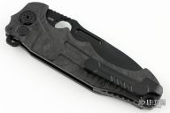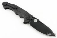 This Pitboss 2 by Andre De Villiers features a black multi-ground blade with thumbhole, notched thumbrest and flipper. It swings smoothly on a ball-bearing system and has both a thumb hole and flipper opener; it can also be opened or closed with a flick of the wrist when the inlaid button lock is held down. A safety switch on the side allows the blade to be locked in the closed position or provides an additional level of safety in the open position. It has a carbon fiber handle with black hardware. A jimped black titanium backstrap with a lanyard hole and a tip-up, titanium pocket clip with hidden screws. "83-2020" on the ricasso. Excellent condition. Comes with a zippered case.