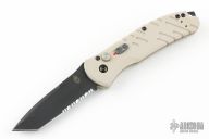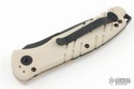This Auto by Gerber features a black tanto blade with serrations, push button and safety. The handle has milled tan G-10 scales and a 3-way stainless steel clip. Comes with original box. Has some light scuffs, otherwise excellent condition.