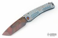 This Marauder from Medford Knife and Tool features a vulcan finish tanto blade with fullers. The handle has a textured and anodized titanium frame over a steel backspacer and titanium tip up clip. Includes original box, dog tag and hard case. Excellent Condition.