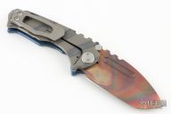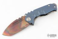 This Micro Praetorian from Medford Knife and Tool features a Vulcan finished tanto blade with notched thumbrest and ambidextrous finger groove. The frame is comprised of stonewashed blue anodized titanium with stonewash titanium tip up pocket clip. Stainless steel backspacer doubles as a glass breaker. Comes with original box, zipper case, and papers. Excellent condition.