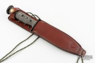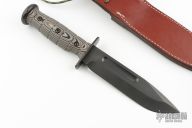 The Fighter™ is our modern enhanced version of the classic Utility knife made famous by the United States Marines . This fixed blade sports a .250” thick S35VN PVD blade, measures near 12” in total length, has 3-D surfaced multi-colored G-10 scales, a 2-piece interlocking Ti PVD hilt and solid Ti PVD pommel. This unique full tang design has all the upside of a classic hidden-tang “slide-over” hilt construction with none of the compromises in strength…as you’d expect, a Medford through and through. With a custom brown leather sheath, a true 21st century fighting knife. Comes with a brown leather sheath and zippered case and box. Excellent condition.