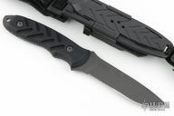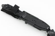 This knife by Gerber is called the Yari II, it features a black partially serrated blade with full tang construction and black aluminum scales, .125" blade stock and 1.041" blade depth. Comes with a molded plastic sheath with belt loop, and original box. Has some light scuffs, excellent condition otherwise.