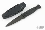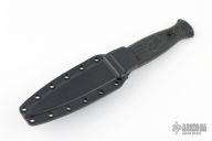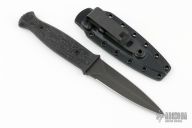 This knife features a black acid tumbled double-edged blade with a full tang construction .147" blade stock and .940" blade depth. The handle has G-10 scales. Comes with a kydex sheath with clip and a hat. Excellent Condition.