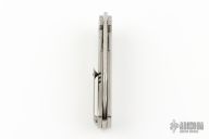 The QSP Rhino is a small-size, heavy-duty flipper knife made from high-quality materials that really bring a lot of muscle to bear. The thick clip point blade is made from quality M390 stainless steel with a satin finish and comes with either a flat grind or compound grind to suit your needs. The knife can be deployed by using either the front or standard flipper tab, or even the large groove along the top of the blade. The titanium handles are shaped and beveled to fit your hand snugly but comfortably with a sturdy frame lock. The backspacer and pocket clip are both made from durable titanium with decorative elements that really bring the knife together.