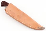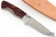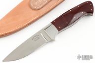 This drop point hunter by Bud Nealy features a hand rub satin finished drop point blade with a full tapered tang construction. .1875" Blade Stock. 1.25" Blade Depth. The handle features linen micarta scales and pinned dovetail bolsters. Includes a brown leather belt sheath. Has a couple light scratches, excellent condition otherwise.