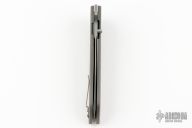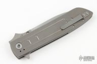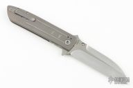 This Dozier Designed Combat Folder by A.G. Russell features a sheepsfoot style satin finish blade with notched thumb ramp and flipper as well as a single thumb stud. The handle is comprised of milled titanium frame over titanium backspacer. Reversible tip up clip. Includes two clips for standard and deep pocket carry. Includes original box. Excellent condition.
