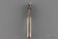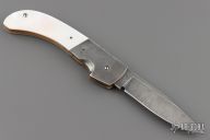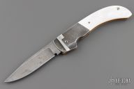 This Bolster Release auto by RB Johnson features a Damascus clip point blade. The handle has blued steel bolsters, beautiful mother of pearl scales, fileworked brass liners, stainless steel backspacer. Nice action, lockup and blade seating. Has some scratches, patina, and some light wear, excellent condition for its age. Made in the 1990's.