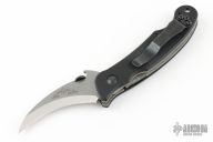 This Elvia by Emerson Knives features a stonewashed hawkbill blade with a black thumbdisc. The handle has black G-10 scales, titanium liners and a black stainless steel tip up clip. Comes with original box and papers. #0382. Has reversable clip. Has some scratches on the clip, excellent condition otherwise.