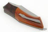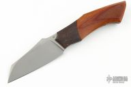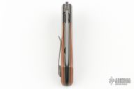 This Front Flipper by Gabriel Berthelemy features a two-tone sheepsfoot-style blade, front flipper opening. The handle has fatcarbon bolsters/backspacer, micarta scales, bead blasted titanium liners with a matching tip up pocket clip.  Rides on bearings, nice detent, lockup and blade seating. Includes the original case and COA.  New from Maker!