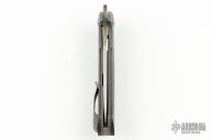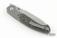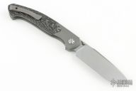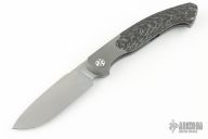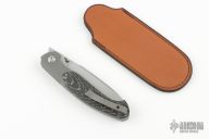 This Front Flipper by Olivier Lamy features a satin finished blade with swedge and notched thumbrest, front flipper style opening. The handle has titanium bolsters, fatcarbon scales with bead blasted titanium liners and backspacer.  Tip up titanium pocket clip. Rides on bearings, nice detent, lockup and blade seating.  Includes the original box, coa and a leather slip sheath.  New from maker!