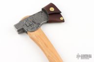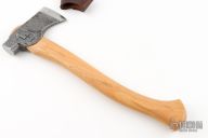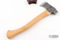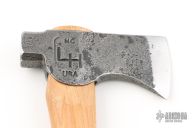 The one and only Hoffman Tappers Hatchet. Hand forged from a block of 4140 chromium molybdenum alloy steel in North Carolina, USA! Hung on straight grained hickory handles, hand carved and sanded from lumber. The back poll is hardened and tempered so it can be used as a proper hammer. Comes shaving sharp, and is excellent to use around the camp site. This one is 1.5 pounds and has a 15.75" handle. Sheaths are hand made with thick vegetable tanned cowhide and snaps. Excellent Condition.