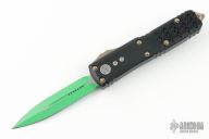 This UTX-85 OTF Automatic from Microtech features a green cerakoted double-edged blade with fuller. The handle has a black aluminum tri grip frame with bronzed steel thumb slide, clip and glass breaker. Dated 04/2022 with a S/N of 5375. Includes original box and papers. Excellent condition.