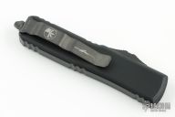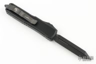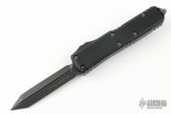 This UTX-85 by Microtech features a DLC spartan double edged blade. The handle has a black aluminum frame with black hardware, black tip down stainless steel clip and glass breaker. Dated 10/2022 and S/N 005. Comes with original box and papers. Excellent condition.