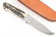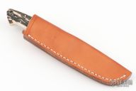 This gorgeous integral drop point hunter by Dietmar Kressler features a hand rub satin finished blade with checkered thumbrest, .148" blade thickness and .839" blade depth, full integral tapered tang construction. The handle is hand rub satin finished with beautiful stag inlays, lanyard hole at the butt and fluted bolsters. Feels great in the hand. The fit and finish is exceptional. Very impressive work. Knife is in excellent condition. Shows no signs of use/carry. Comes in a brown leather sheath with belt loop.