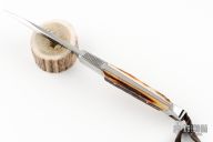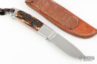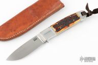This integral Drop Point Hunter from Dietmar Kressler features a drop point hand rubbed satin finish blade with a checkered thumbrest, .160" blade stock and .990" blade depth. The handle has integral fluted bolsters and beautiful stag scales with red liners and a full tapered tang. Comes with a brown leather sheath with belt loop and zippered case. Excellent condition. A beautiful piece.