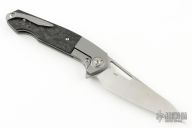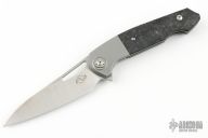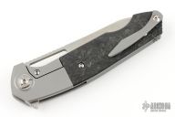 The Eraser flipper is a slim EDC design from Liong Mah Design. It has a titanium handle with a marbled carbon fiber overlay, leaving the bolster uncovered. It sports a Bohler M390 steel blade that has a strip of jimping along the spine. This impressive design is rounded off with a milled pocket clip, a hidden lanyard tube, and a milled backspacer. Features: Ball-bearing pivot offers swift, responsive blade deployment. Titanium frame provides a durable, lightweight build. M390 blade steel offers a excellent cutting performance and edge retention. Comes with original zippered case. Excellent condition.