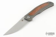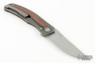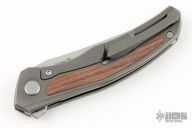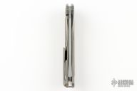 This Quantum Ursus NL by Shirogorov features a tumble finish blade with notched thumbrest and flipper. The handle has a blasted and milled titanium frame, rosewood inlay, backspacer, tip up titanium clip with hidden screws. Rides on SRBS, nice detent, lockup and blade seating. Comes with original box and COA. Excellent condition. Cromax PM blade steel.