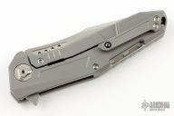 This K-3 by Reate Knives features a satin finished clip point blade with notched thumbrest and flipper. The handle has a bead blasted titanium frame with MokuTi inlays, bead blasted titanium backspacer and tip up clip with ceramic ball. Stainless lockface insert. Comes with nylon zippered case and original box. Excellent condition.
