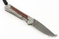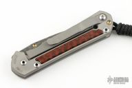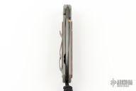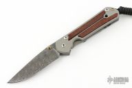 This Small Sebenza 21 by Chris Reeve has a Devin Thomas stainless steel "raindrop" Damascus blade with dual thumbstuds and notched thumbrest. Handle is two-tone bead blasted and satin finished titanium with snakewood inlays, bead blasted tip up clilp, and anodized lanyard pin and barrel spacer. Nice lockup detent, and blade seating. Comes with original box, leather sheath, cloth, tool, lube and papers dated SEPT 28 2016.Has been after market customized according to CRK. Excellent condition.
