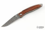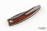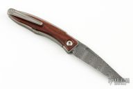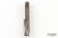 This Mnandi has a Devin Thomas Ladder Damascus blade with notched thumbrest and nail nick. The handle has a bead blasted and satin finished titanium frame with cocobolo inlays. Titanium clip, tip up carry. Comes in original COA dated December 15, 2015, cloth, tool, and Reeve box. Excellent condition.