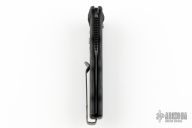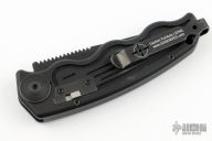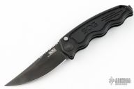This SOG-TAC Auto Mini has a black finish upswept blade with notched thumb rest and partial serrations. Handle is black anodized aluminum with safety, lanyard hole, and stainless steel tip up clip. Comes with original box and papers.  Excellent Condition.
