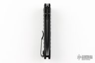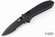 This knife features a black drop point blade with partial serrations. The handle has black aluminum scales over steel liners and a steel tip up pocket clip. Includes the original box and papers. Excellent Condition.