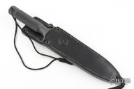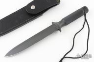This Project 1 Fixed Blade by Chris Reeve has a non-reflective Kalgard coated A2 stainless steel spear point partially serrated blade, .260" blade stock, 1.242" depth. Handle and blade are both made from a single block of steel. Handle is knurled with double guard and removable butt cap with lanyard hole. Comes with original black leather sheath, box, and papers dated FEB 27, 2001. Has some light scratches, otherwise excellent condition.
