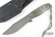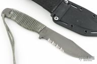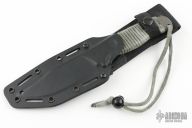 "The MPS was designed as a flat and compact knife that was purposely designed to fit in the sheath on the United States Air Force, Navy, Marine Corps, and Army pilot survival vest. The blade is a smaller version of the MPK and the same versatile blade belly makes it a superior utility and survival model. The skeletonized handle allows this knife to fulfill requirements where ultimate lightweight and thin profiles are demanded. Regardless of whether you pilot an F/A-18 strike fighter from an aircraft carrier, a C130 aircraft for AFSOC or an Apache helicopter, this knife is always out of your way but always ready for immediate and intense use. Military and law enforcement personnel like the MPS because of its durability, lightweight and overall tough characteristics. It works equally well in desert or arctic conditions due to the specialized titanium construction ensuring that it will not break in subzero weather as steel does. Military personnel choose it because it makes an excellent all purpose work knife. They have told us that the MPS is the perfect utility knife and is widely used in SERE and many other applications." This MPS by Mission Knives has a bead blasted titanium blade with partially serrated edge and false top edge, .253" blade stock and 1.396" blade depth, full tang construction. Comes with black kydex sheath. Scuffs and scratches are visible on the blade and handle otherwise the knife is in excellent condition.