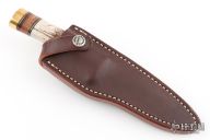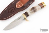 This Model 26 Pathfinder by Randall Made Knives is one of Randall's best-selling models. It features a drop point satin finished blade with .170" blade stock and .937" blade depth, hidden tang construction. The handle has a brass guard and butt, stag grip and black/brass/leather spacers. Comes with a brown leather sheath. Excellent condition.