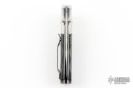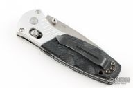 This Mini-Barrage from Benchmade features a stonewash drop point blade with swedge and dual thumbstuds. The handle has alumnium bolsters and black G10 scales over stainless steel liners. This knife also features the AXIS lock mechanism and sliding safety on spine. Includes the original box and papers. Excellent condition.