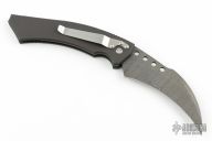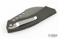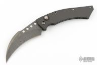 This side opening automatic by Anthony Marfione features a hawkbill Damascus blade. The handle is black aluminum with a notched thumbrest and notches near butt. Black lip pearl inlaid push button. Satin finished Stainless steel clip, tip down carry. Dated 1/2000. Comes with a white box. Has a couple light scuffs, otherwise excellent condition.