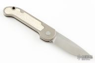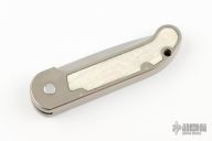 This auto by Kelgin knives features a satin finished blade with a titanium frame and two bone inlays. Strong action. Comes in a small nylon belt sheath. Light scratches are visible on the frame otherwise the knife is in excellent condition.
