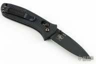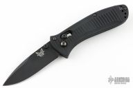 This 525 Presidio by Benchmade features a black finish drop point blade with swedge and dual thumb studs. The handle has a black Aluminum over black steel liners and barrel spacers. Axis lock mechanism. Black coated tip up clip is reversible for left or right hand carry. Includes the original box and papers. Excellent condition.