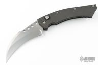 This Hawk side-opening automatic by Microtech knives has a satin finish blade hand-rubbed by Walter Brend and is sterile with no markings, the blade was ground by Reese Weiland. The handle is black aluminum with a bead blasted stainless steel tip down clip. Comes with original box and papers. Dated 03/2000 and #029. Has a couple light scuffs, otherwise Excellent condition.