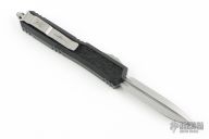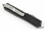 This Makora OTF automatic by Microtech features a stonewashed double edge blade. The handle has a black aluminum frame with nonslip inlays, stainless steel clip, tip down carry. Dated 11/2023 and 5815 on clip. Comes with the original box and papers. Excellent Condition.