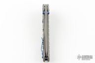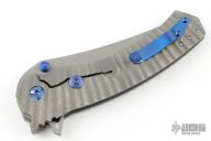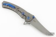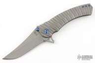 This custom Fenris Flipper by Will Zermeno features a stonewashed blade with flipper. The handle has a stonewashed and milled titanium frame and anodized hardware and pocket clip for tip up carry, lockbar stabilizer. Nice detent, lock up and blade seating. Excellent condition. Comes with a zippered case.