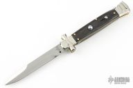 This lockback Auto by AGA Campolin has a stainless steel spear point blade with false top edge. Handle is Ebony with nickel silver bolsters, brass liners, stainless steel backspacer. Comes with original box. Excellent condition.