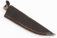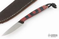 This knife by TM Hunt features a satin finished blade with .094" blade stock and .772" blade depth, full tang construction. The handle has bullseye micarta scales. Comes with a brown leather sheath, box and papers. Excellent condition.