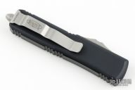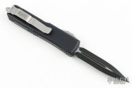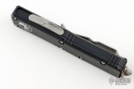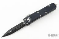 This UTX-85 OTF automatic by Microtech knives features a D/E black double edged blade with a standard edge, and a black aluminum handle with blasted hardware, tip down carry. Glass breaker. S/N 53936. Dated 05/2020. Comes with original box and papers. Excellent condition.