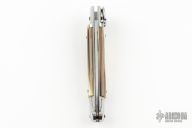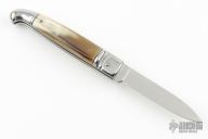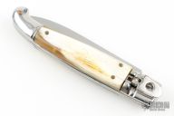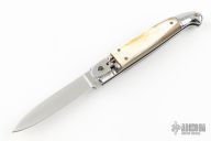 This leverlock auto features a high satin finished blade with a stainless spring. The handle has stainless bolsters and butt, blonde scales and stainless liners. Has some scratches and patina, otherwise excellent condition.