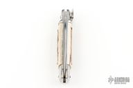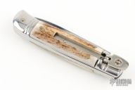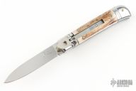 This Lever Lock Auto has a mirror polished stainless steel spear point blade. Handle has horn scales, steel front and rear bolsters, stainless steel liners and a nickel silver lock release button. Has some scuffs and patina, otherwise excellent condition.