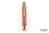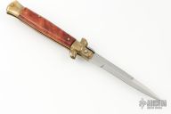 This Rear Release Picklock Auto features a mirror finish spear point blade. The handle consists of brass bolsters and wood scales over brass liners and stainless steel backspacer. Has a few light scratches, and patina otherwise excellent condition.