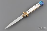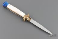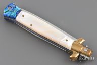 This 11" Bolster Release Auto features a mirror polished bayonet ground blade with false top edge, 3mm thick blade. The handle has brass bolsters, rear with blue liners and faux abalone, brass liners and stainless steel spring. Has some patina, otherwise excellent condition. Opens with a swivel of the guard, closes with the picklock