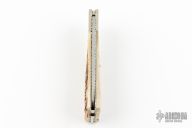 This lockback by Harvey Otis McBurnette features a mirror polished blade with nail nick The handle has engraved nickel silver dovetailed bolsters, nickel silver pins, stag covers, fileworked nickel silver liners, stainless steel backspacer. Nice lockup, function and blade seating. Has a couple light scratches, othewise excellent condition.