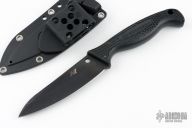 This Aqua Salt by Spyderco features a black FRN handle. Has a black blade that has .118" thickness and 1.129" depth, hidden tang construction. H1 steel. Has a black molded plastic sheath with belt clip. Has some scuffs and scratches, great user condition.